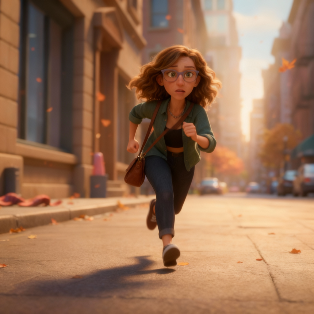 • “Personaje Pixar corriendo por una calle de otoño, perspectiva baja, hojas cayendo”